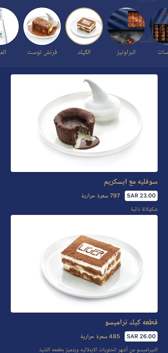 - Liger Sweets: Highlighting their rich Liger Cake, layers of moist chocolate sponge and creamy chocolate, this dessert is both decadent and elegant at SAR 29.00. Other must-tries include the comforting Chocolate Chip Cookie for just SAR 13.00, and the classic Tiramisu Cake.